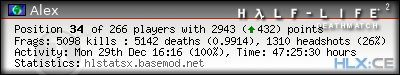 | Rank | Server | Kills | % | Ratio | Deaths | K:D | Headshots | Percentage of Headshots | % | HS:K |