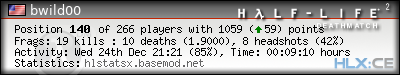 | Rank | Server | Kills | % | Ratio | Deaths | K:D | Headshots | Percentage of Headshots | % | HS:K |