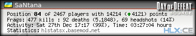| Rank | Server | Kills | % | Ratio | Deaths | K:D | Headshots | Percentage of Headshots | % | HS:K |