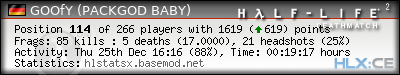 | Rank | Server | Kills | % | Ratio | Deaths | K:D | Headshots | Percentage of Headshots | % | HS:K |
