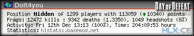 | Rank | Server | Kills | % | Ratio | Deaths | K:D | Headshots | Percentage of Headshots | % | HS:K |