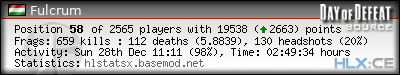 | Rank | Server | Kills | % | Ratio | Deaths | K:D | Headshots | Percentage of Headshots | % | HS:K |