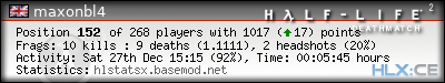 | Rank | Map | Kills | % | Ratio | Deaths | % | Ratio | K:D | Headshots | % | Ratio | HS:K |