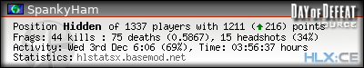 | Rank | Server | Kills | % | Ratio | Deaths | K:D | Headshots | Percentage of Headshots | % | HS:K |