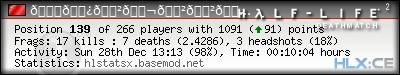 | Rank | Server | Kills | % | Ratio | Deaths | K:D | Headshots | Percentage of Headshots | % | HS:K |