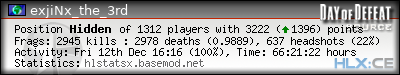 | Rank | Server | Kills | % | Ratio | Deaths | K:D | Headshots | Percentage of Headshots | % | HS:K |