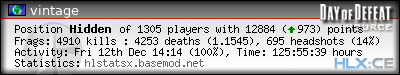 | Rank | Server | Kills | % | Ratio | Deaths | K:D | Headshots | Percentage of Headshots | % | HS:K |