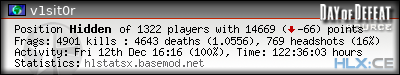 | Rank | Server | Kills | % | Ratio | Deaths | K:D | Headshots | Percentage of Headshots | % | HS:K |