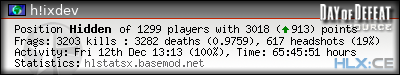 | Rank | Server | Kills | % | Ratio | Deaths | K:D | Headshots | Percentage of Headshots | % | HS:K |