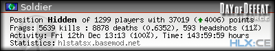 | Rank | Server | Kills | % | Ratio | Deaths | K:D | Headshots | Percentage of Headshots | % | HS:K |