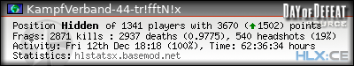 | Rank | Server | Kills | % | Ratio | Deaths | K:D | Headshots | Percentage of Headshots | % | HS:K |