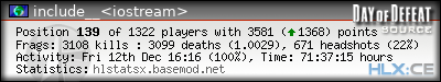 | Rank | Server | Kills | % | Ratio | Deaths | K:D | Headshots | Percentage of Headshots | % | HS:K |