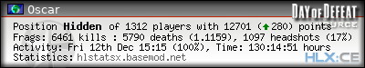 | Rank | Server | Kills | % | Ratio | Deaths | K:D | Headshots | Percentage of Headshots | % | HS:K |