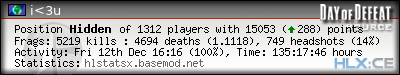 | Rank | Server | Kills | % | Ratio | Deaths | K:D | Headshots | Percentage of Headshots | % | HS:K |