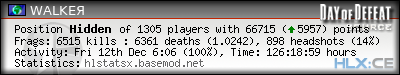 | Rank | Server | Kills | % | Ratio | Deaths | K:D | Headshots | Percentage of Headshots | % | HS:K |