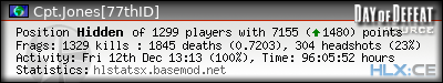 | Rank | Server | Kills | % | Ratio | Deaths | K:D | Headshots | Percentage of Headshots | % | HS:K |