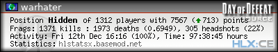 | Rank | Server | Kills | % | Ratio | Deaths | K:D | Headshots | Percentage of Headshots | % | HS:K |