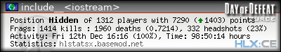 | Rank | Server | Kills | % | Ratio | Deaths | K:D | Headshots | Percentage of Headshots | % | HS:K |