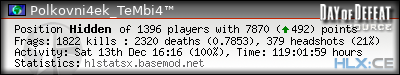 | Rank | Server | Kills | % | Ratio | Deaths | K:D | Headshots | Percentage of Headshots | % | HS:K |