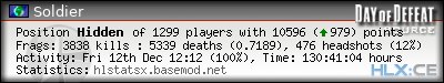 | Rank | Server | Kills | % | Ratio | Deaths | K:D | Headshots | Percentage of Headshots | % | HS:K |
