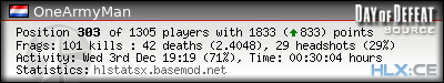 | Rank | Server | Kills | % | Ratio | Deaths | K:D | Headshots | Percentage of Headshots | % | HS:K |