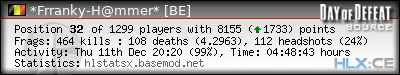 | Rank | Victim | Kills | % | Ratio | Deaths | % | Ratio | K:D | Headshots | % | Ratio | HS:K |