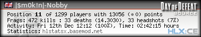 | Rank | Server | Kills | % | Ratio | Deaths | K:D | Headshots | Percentage of Headshots | % | HS:K |