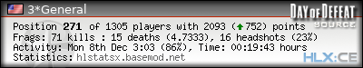| Rank | Server | Kills | % | Ratio | Deaths | K:D | Headshots | Percentage of Headshots | % | HS:K |