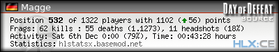 | Rank | Server | Kills | % | Ratio | Deaths | K:D | Headshots | Percentage of Headshots | % | HS:K |