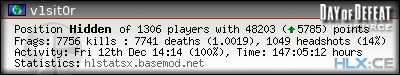 | Rank | Server | Kills | % | Ratio | Deaths | K:D | Headshots | Percentage of Headshots | % | HS:K |