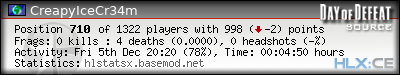 | Rank | Map | Kills | % | Ratio | Deaths | % | Ratio | K:D | Headshots | % | Ratio | HS:K |