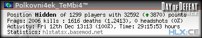 | Rank | Server | Kills | % | Ratio | Deaths | K:D | Headshots | Percentage of Headshots | % | HS:K |