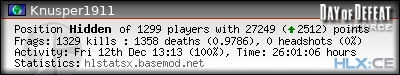 | Rank | Server | Kills | % | Ratio | Deaths | K:D | Headshots | Percentage of Headshots | % | HS:K |