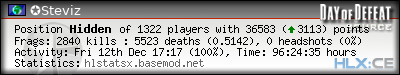 | Rank | Server | Kills | % | Ratio | Deaths | K:D | Headshots | Percentage of Headshots | % | HS:K |