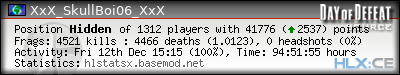 | Rank | Server | Kills | % | Ratio | Deaths | K:D | Headshots | Percentage of Headshots | % | HS:K |