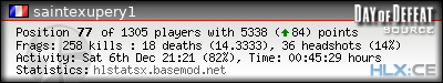 | Rank | Server | Kills | % | Ratio | Deaths | K:D | Headshots | Percentage of Headshots | % | HS:K |