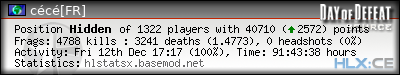 | Rank | Server | Kills | % | Ratio | Deaths | K:D | Headshots | Percentage of Headshots | % | HS:K |