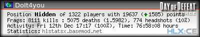 | Rank | Server | Kills | % | Ratio | Deaths | K:D | Headshots | Percentage of Headshots | % | HS:K |