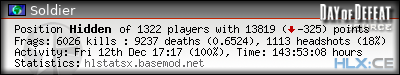 | Rank | Server | Kills | % | Ratio | Deaths | K:D | Headshots | Percentage of Headshots | % | HS:K |
