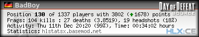 | Rank | Server | Kills | % | Ratio | Deaths | K:D | Headshots | Percentage of Headshots | % | HS:K |