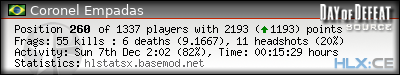 | Rank | Server | Kills | % | Ratio | Deaths | K:D | Headshots | Percentage of Headshots | % | HS:K |